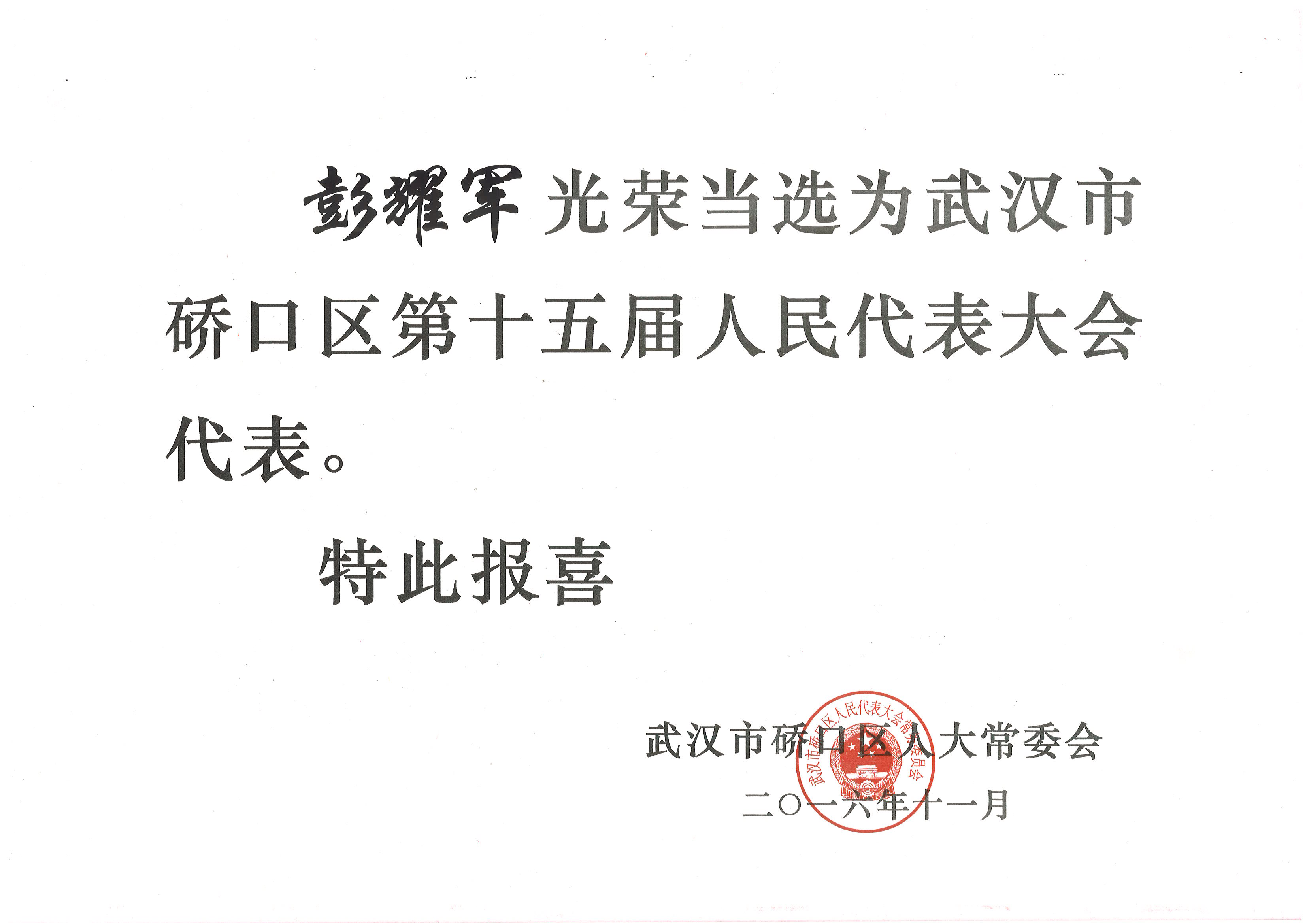 2016年12月1日,一紙大紅喜報(bào)傳來喜訊:中交公路規(guī)劃設(shè)計(jì)院有限公司武漢辦事處主任、華杰工程咨詢有限公司中南分公司總經(jīng)理彭耀軍光榮當(dāng)選武漢市硚口區(qū)第十五屆人民代表大會(huì)代表。