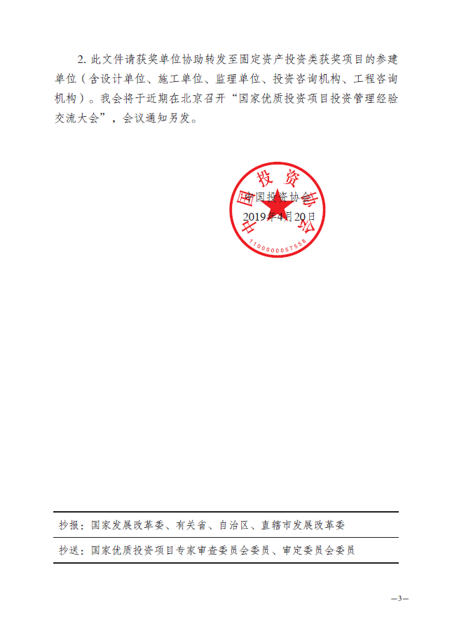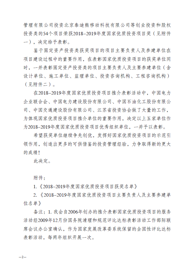 附《關(guān)于表彰2018-2019年度國(guó)家優(yōu)質(zhì)投資項(xiàng)目的決定》(中投協(xié)[2019]1號(hào))。