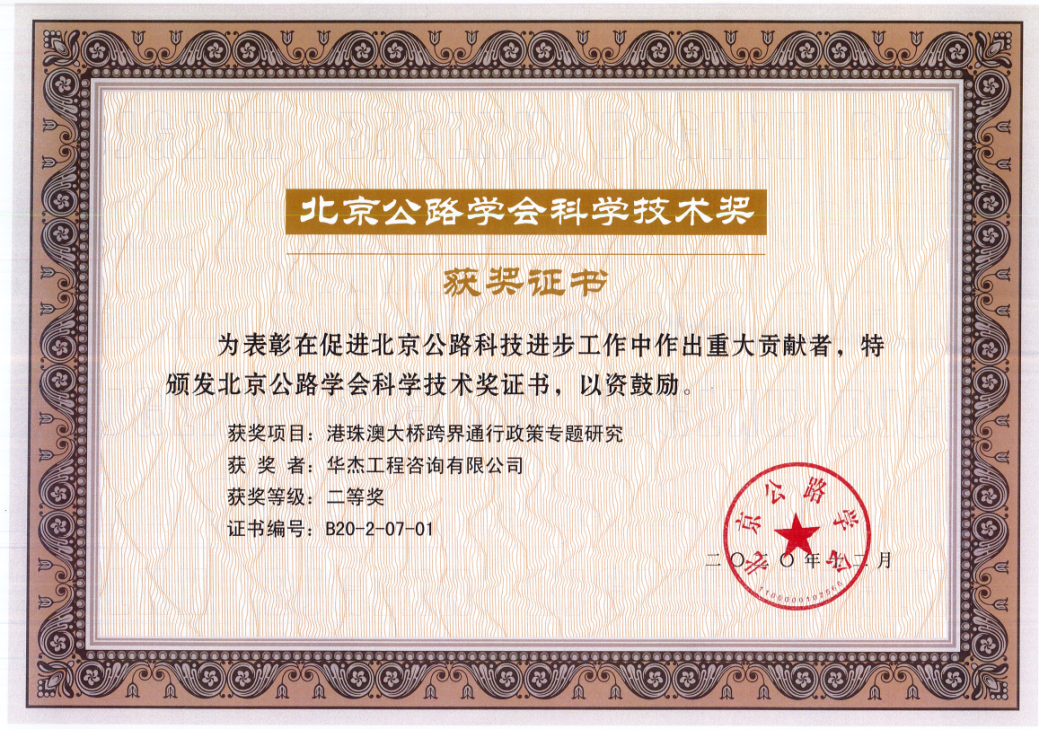 4月20日,2020年度北京公路學(xué)會科學(xué)技術(shù)獎?lì)C獎會在京召開。華杰公司申報(bào)的《港珠澳大橋跨界通行政策專題研究》《新型城鎮(zhèn)化下普通國省干線公路功能分類關(guān)鍵技術(shù)研究》兩個(gè)項(xiàng)目,分別榮獲2020年度北京公路學(xué)會科學(xué)技術(shù)獎二、三等獎。