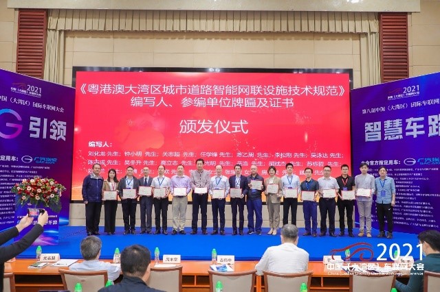 在標(biāo)準(zhǔn)發(fā)布會上,公司代表編寫組解讀發(fā)表了《粵港澳大灣區(qū)城市道路智能網(wǎng)聯(lián)設(shè)施技術(shù)規(guī)范》標(biāo)準(zhǔn)要點主題演講。中國(大灣區(qū))國際車聯(lián)網(wǎng)大會組委會、廣東省車聯(lián)網(wǎng)產(chǎn)業(yè)聯(lián)盟向主參編單位頒發(fā)了牌匾和榮譽證書、成立了粵港澳大灣區(qū)車聯(lián)網(wǎng)標(biāo)準(zhǔn)工作委員會。鐘小明、李瑞美獲得標(biāo)準(zhǔn)編寫人榮譽證書,獲得2021年度車聯(lián)網(wǎng)杰出人物獎。