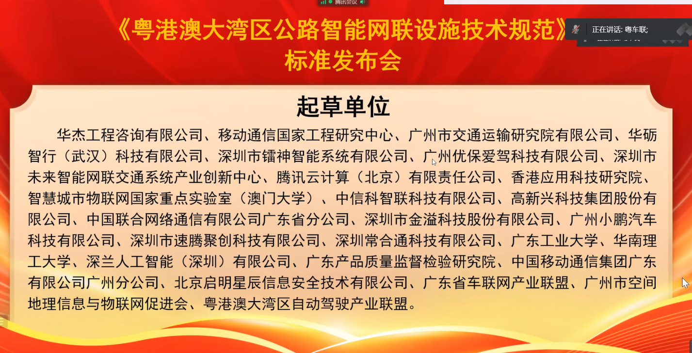 2022年12月30日,《粵港澳大灣區(qū)公路智能網(wǎng)聯(lián)設(shè)施技術(shù)規(guī)范》在國家團(tuán)體標(biāo)準(zhǔn)信息服務(wù)平臺(tái)發(fā)布,公司作為規(guī)范編制組總體單位參加線上標(biāo)準(zhǔn)發(fā)布儀式,公司副總工鐘小明代表編制組發(fā)言,編制組成員賈嘉、張健、李瑞美、其他編制單位代表及新聞媒體代表約80人出席發(fā)布會(huì)。